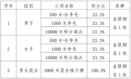速度轮滑设须眉集体积分赛(500米+D抢先、1000米抢先、10000米积分裁减)、速度轮滑女子集体积分赛(500米+D抢先、1000米抢先、10000米积分裁减)、速度轮滑3000米男女夹杂接力赛三个小项。施行中国轮滑协会最新核定的《速度轮滑竞赛法则取裁判公例》及世界轮滑结合会最新修订条目。速度轮滑须眉集体积分赛、速度轮滑女子集体积分赛排名法子按各小项名次积分之和排序,各小项第1-8名别离按9、7、6、5、4、3、2、1计较得分;获第9名及之后名次的活动员得1分。如集体积分相等,冠军多者列前,冠军数相等,亚军多者列前,以此类推。3000米男女夹杂接力赛,各单元可报4名活动员(含1名替补),参赛的3名活动员不得单一性别,且每人至多完成3次接力。